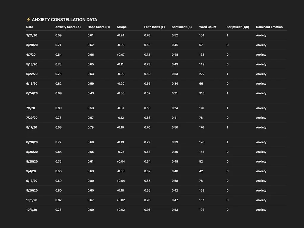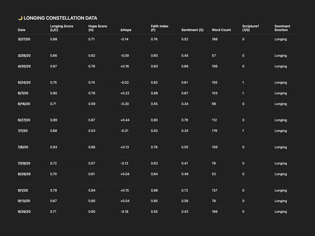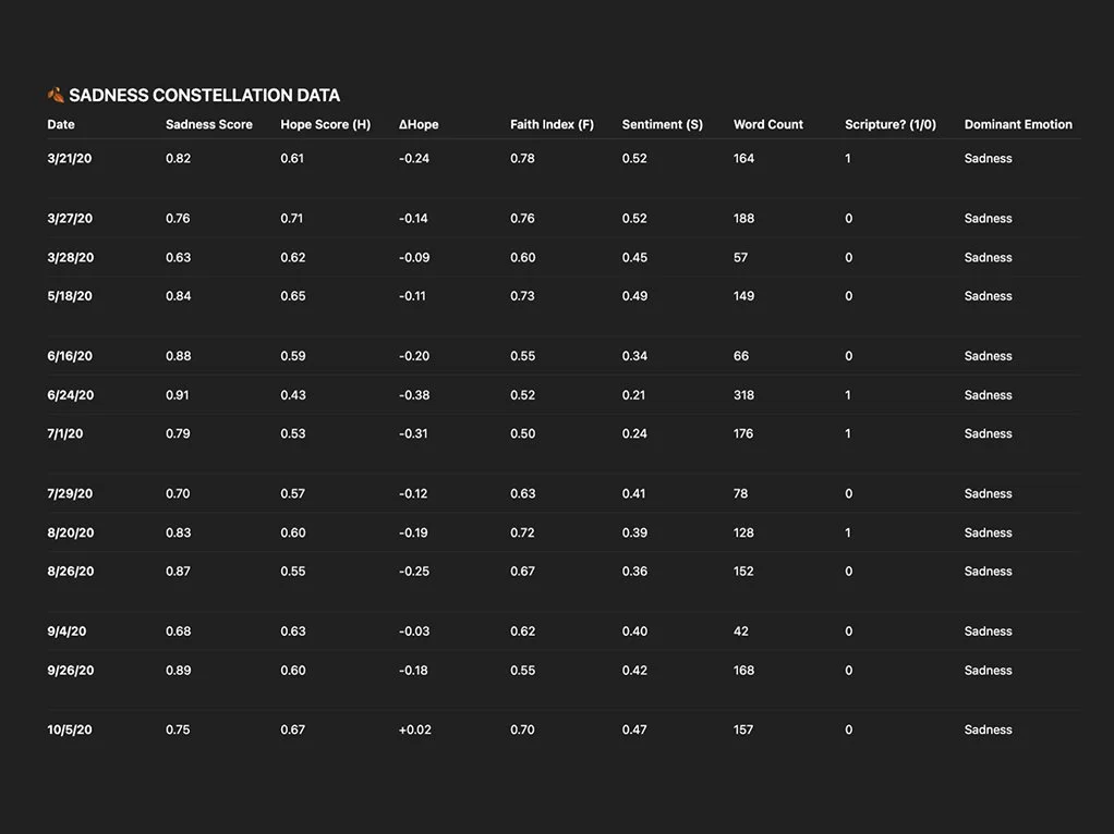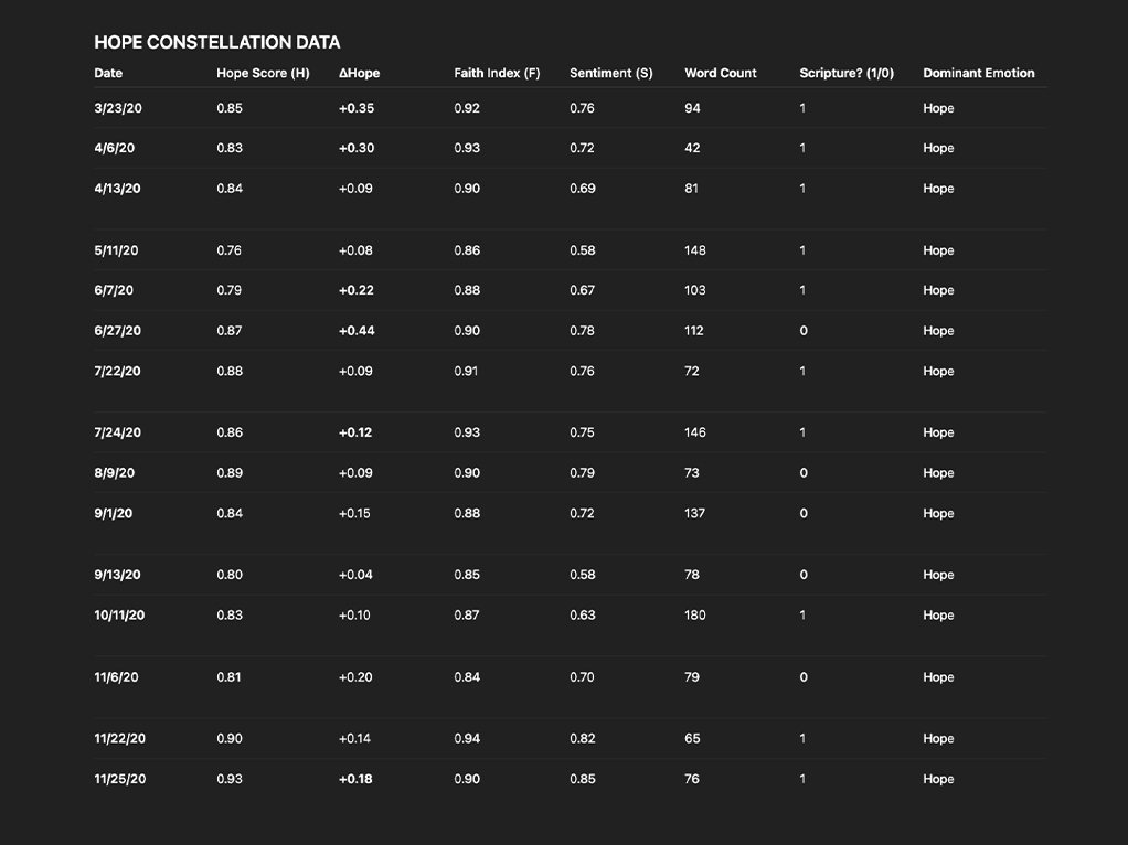 Instead of just “word frequency” (e.g., how often I say “faith” or “hope”), my formulas account for context, whether faith is expressed as doubt, surrender, or confidence.