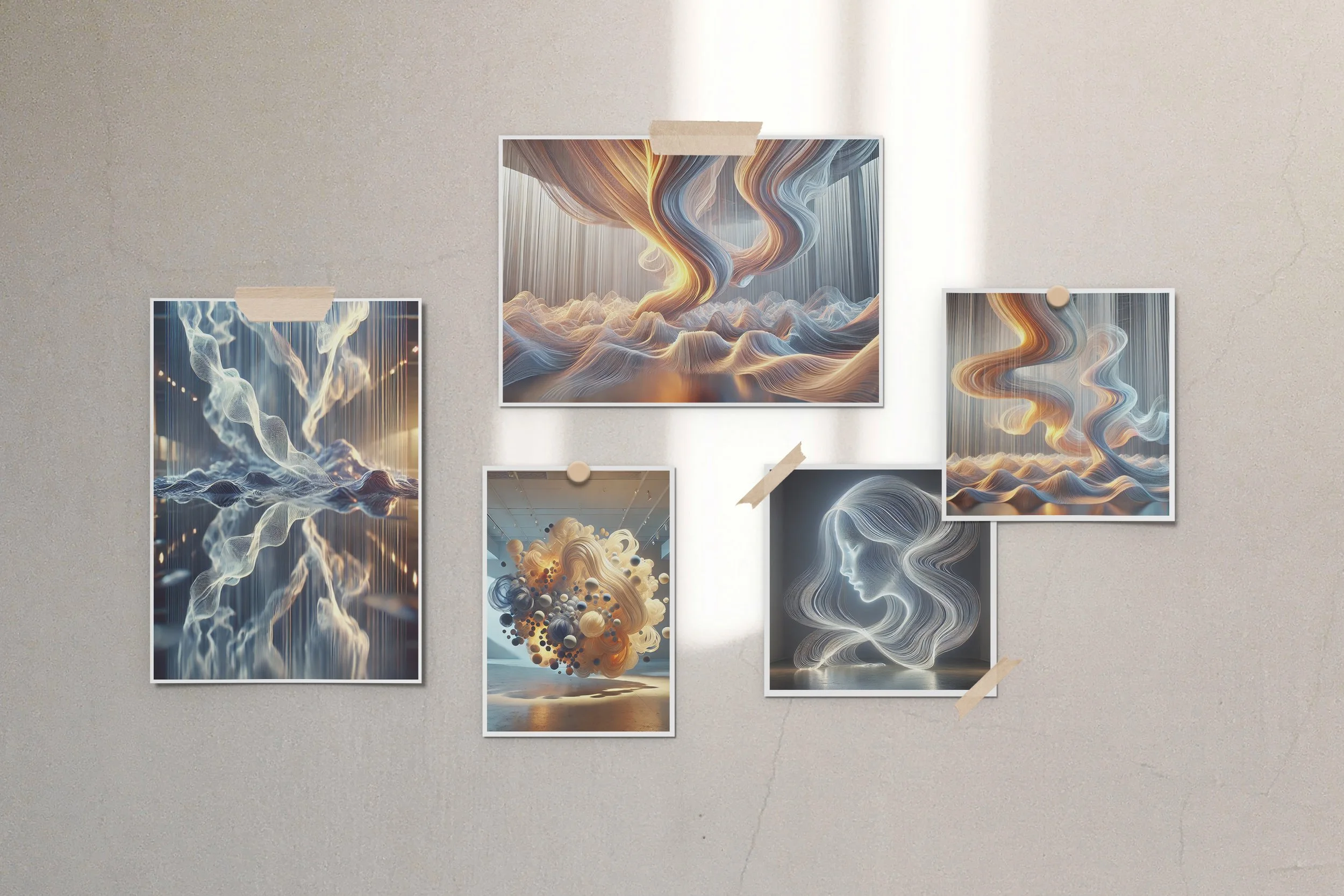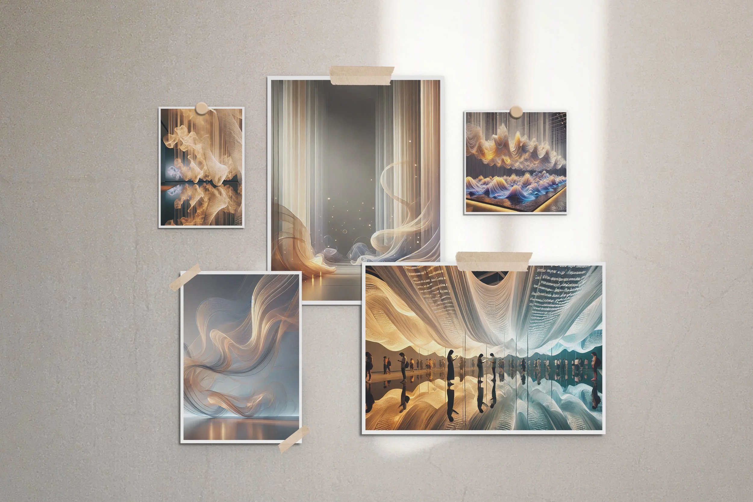 The renderings result from my “training” Dall-E on the data I gathered using my subjective formulas. The peaks and valleys show the emotional intensities, the colors show the tone of the memory, and lower reflective surfaces symbolize how we reflect on the past and often remember it differently. Additionally, the ribbons are made of text from my journals, allowing viewers to be immersed in the data poetically.