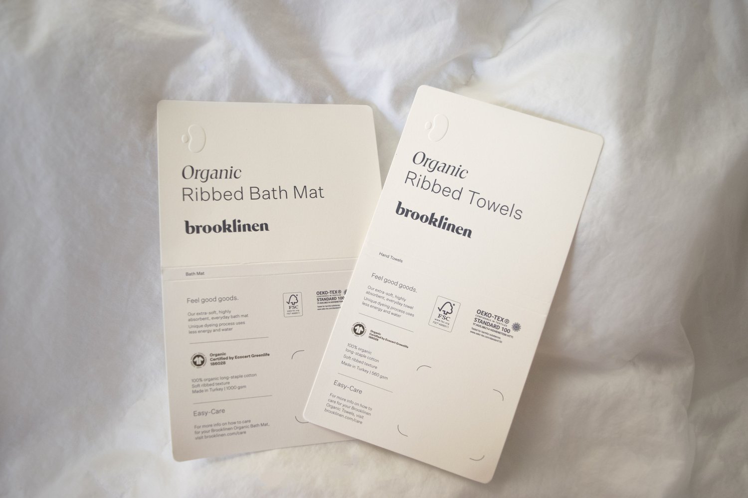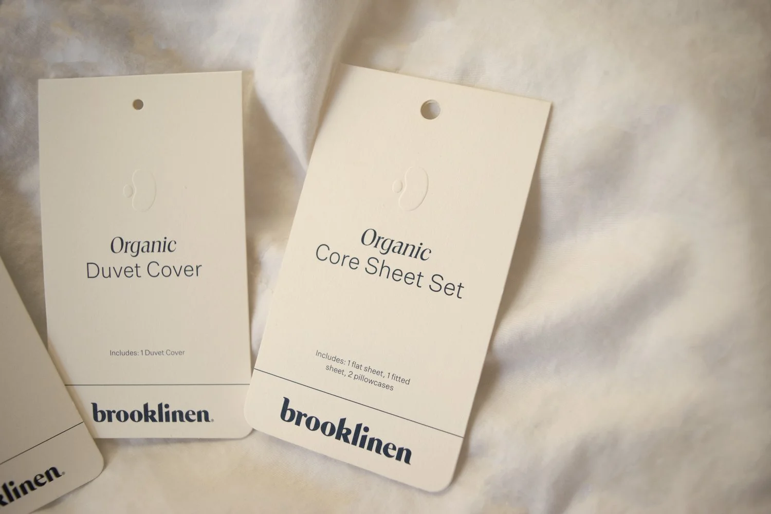 In 2023, Brooklinen introduced its Organic Collection; featuring hangtags and clamshells, designed with love using Adobe Illustrator. We wanted to capture the essence of simplicity and cleanliness, so we opted for white paper, rounded corners, and an embossed bean shape. This soft and delicate bean symbolizes the easy organic feel that our collection embodies.