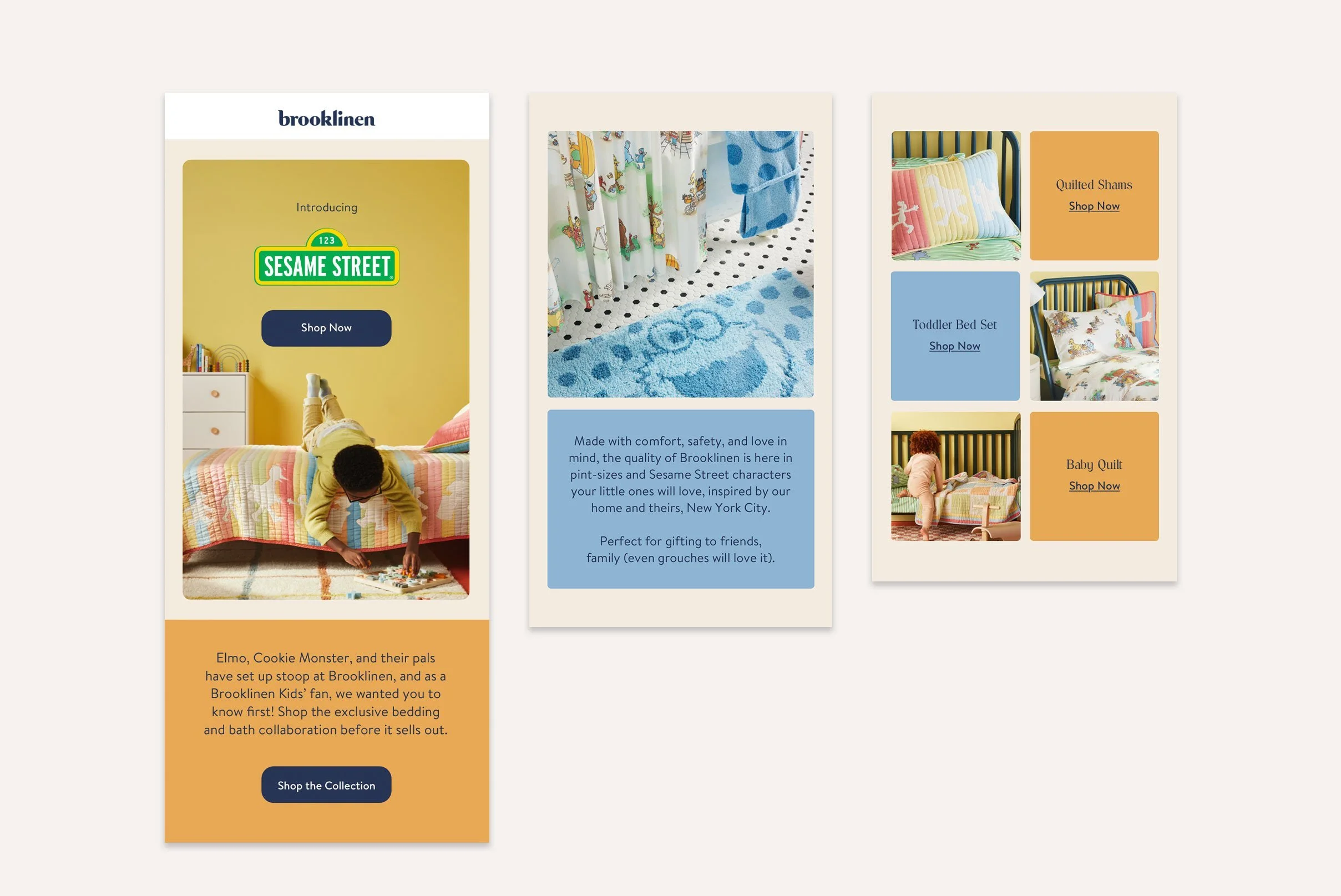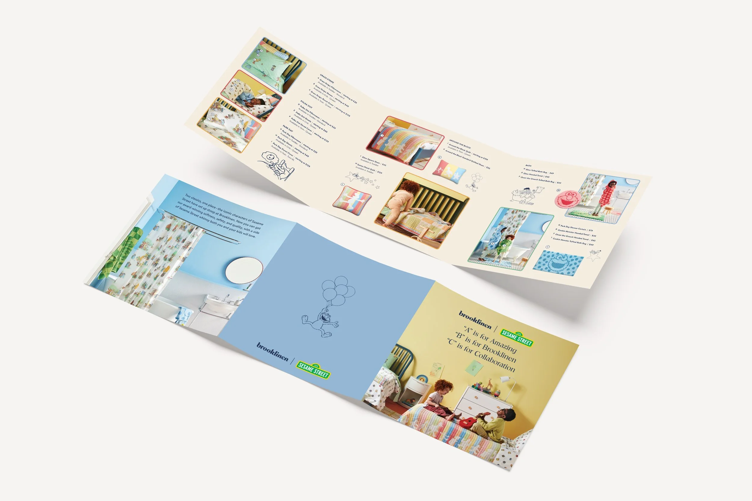 I drew inspiration for the packaging from shapes found in New York Brownstones, and rounded squares that resembled building blocks. To tie everything together, I brought the fabric pantones and character outlines into the print & digital pieces for a cohesive look that brought the sweet Sesame Street personality while adhering to Brooklinen’s style.