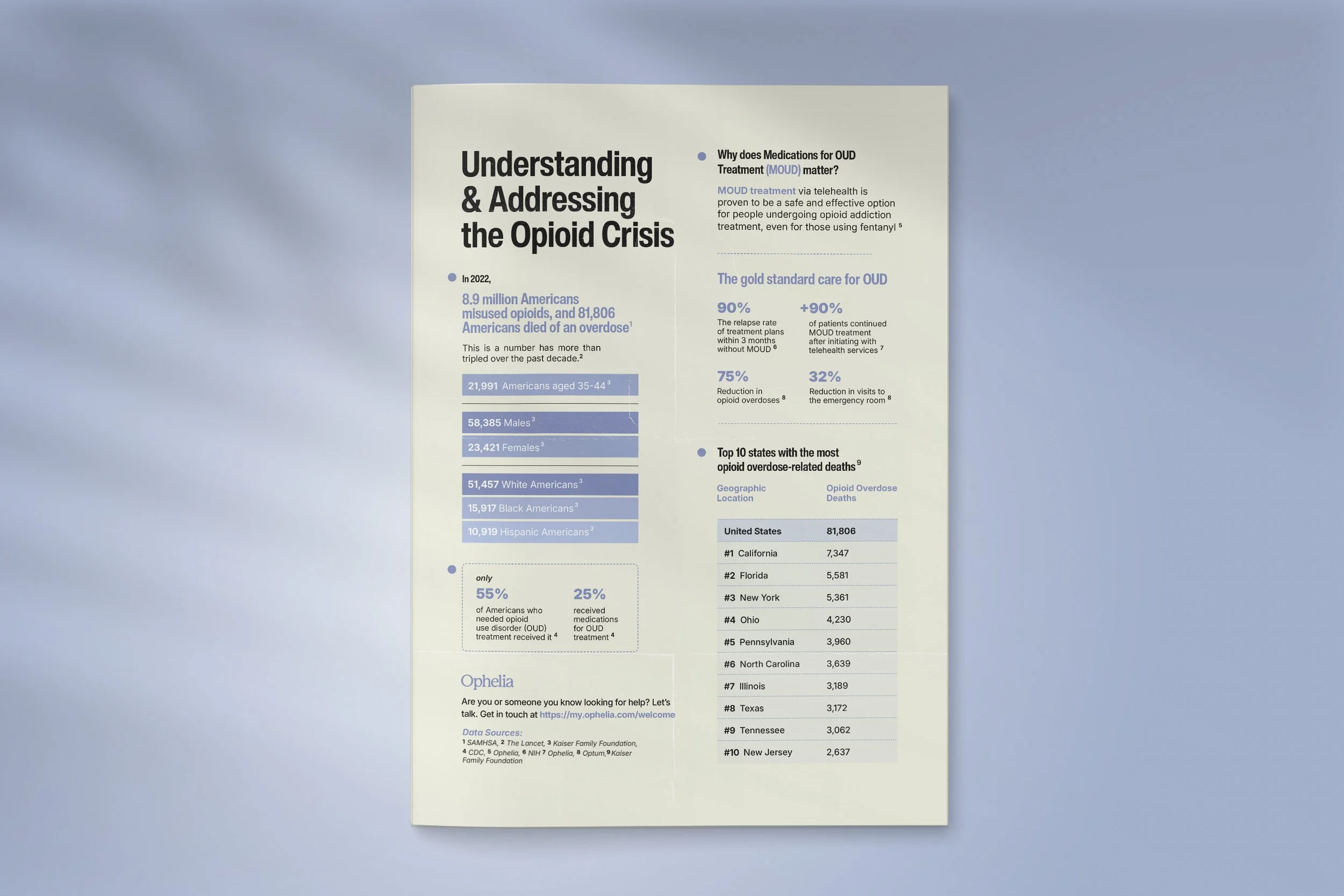 As a Senior Designer at Ophelia, I lead design projects that work to reimagine how we experience and talk about opioid use disorder (OUD).
